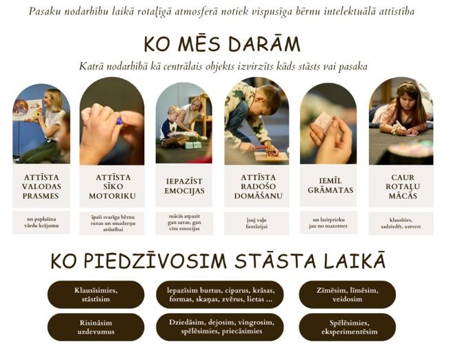Šādi līdzdarbojoties pasakas stāstījumam, bērni patiesi IEMĪL grāmatas jau no mazotnes. Tanī pat laikā, CAUR ROTAĻU, brīvā un nepiespiestā atmosfērā viņi ir guvuši jaunas, attīstošas prasmes un iemaņas: